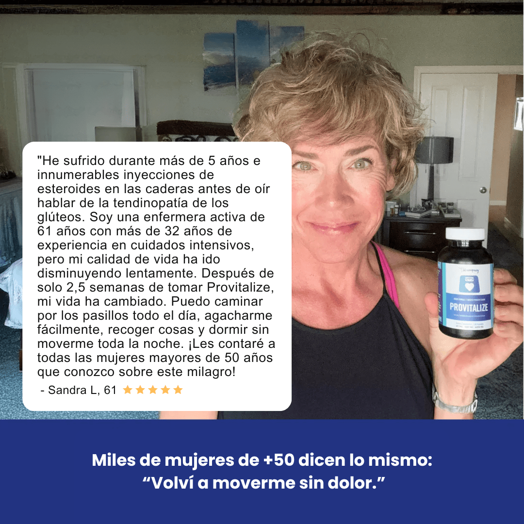 Llevaba meses con dolor en una cadera, me costaba dormir y caminar. Probé Provitalize sin mucha fe, pero en menos de tres semanas ya noté la diferencia. Hoy duermo de lado y camino sin pensar en el dolor.